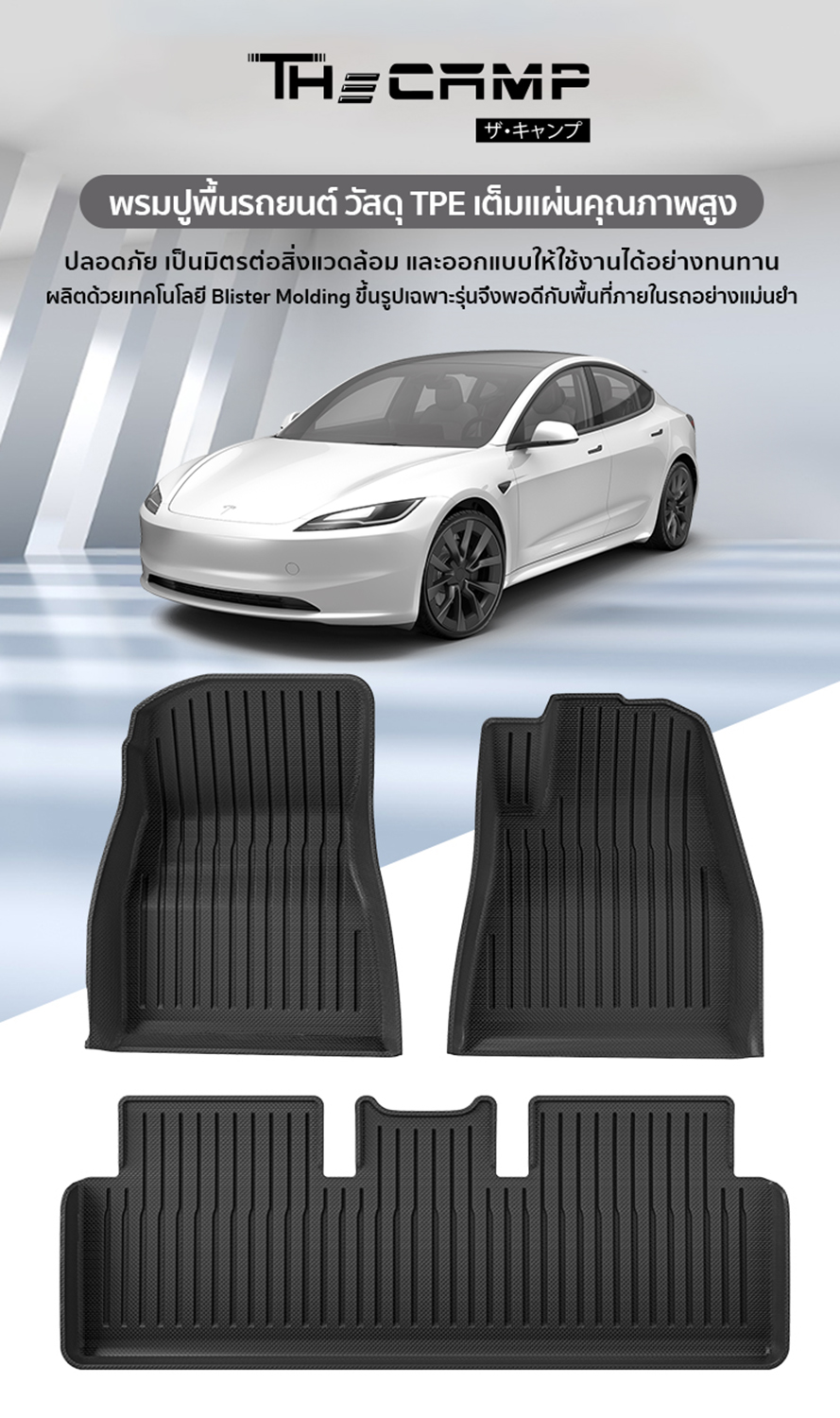 พรมปูพื้นรถยนต์ดีไซน์พรีเมียม ออกแบบเฉพาะสำหรับ Tesla Model 3 โครงสร้าง 3D เข้ารูปพอดีกับพื้นรถ ช่วยปกป้องพื้นรถจากฝุ่น โคลน น้ำ และคราบสกปรก พร้อมวัสดุ TPE คุณภาพสูง ทนทาน ไม่มีกลิ่น และทำความสะอาดง่าย